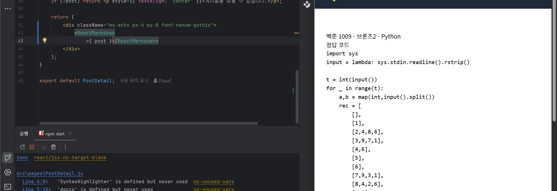 다만 아직 문제가 있죠? 코드를 보여주는 부분에 syntax lint가 없어 코드가 잘 보이지 않는 경향이 있습니다.