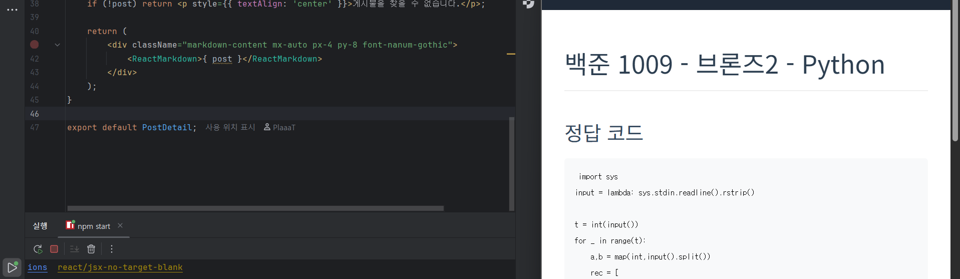 을 통해서 react-markdown 라이브러리를 설치 할 수 있어요.