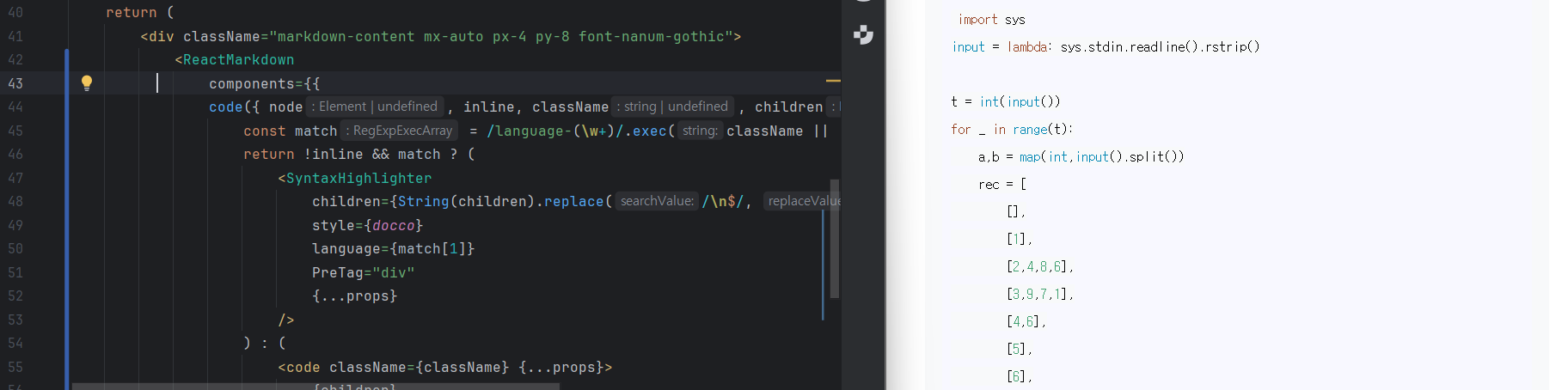 <div className="markdown-content mx-auto px-4 py-8 font-nanum-gothic"> <ReactMarkdown components={{ code({ node, inline, className, children, ...props }) { const match = /language-(\w+)/.exec(className || '') return !inline && match ? ( <SyntaxHighlighter children={String(children).replace(/\n$/, '')} style={docco} language={match[1]} PreTag="div" {...props} /> ) : ( <code className={className} {...props}> {children} </code> ) }, }}>{ post }</ReactMarkdown> </div>